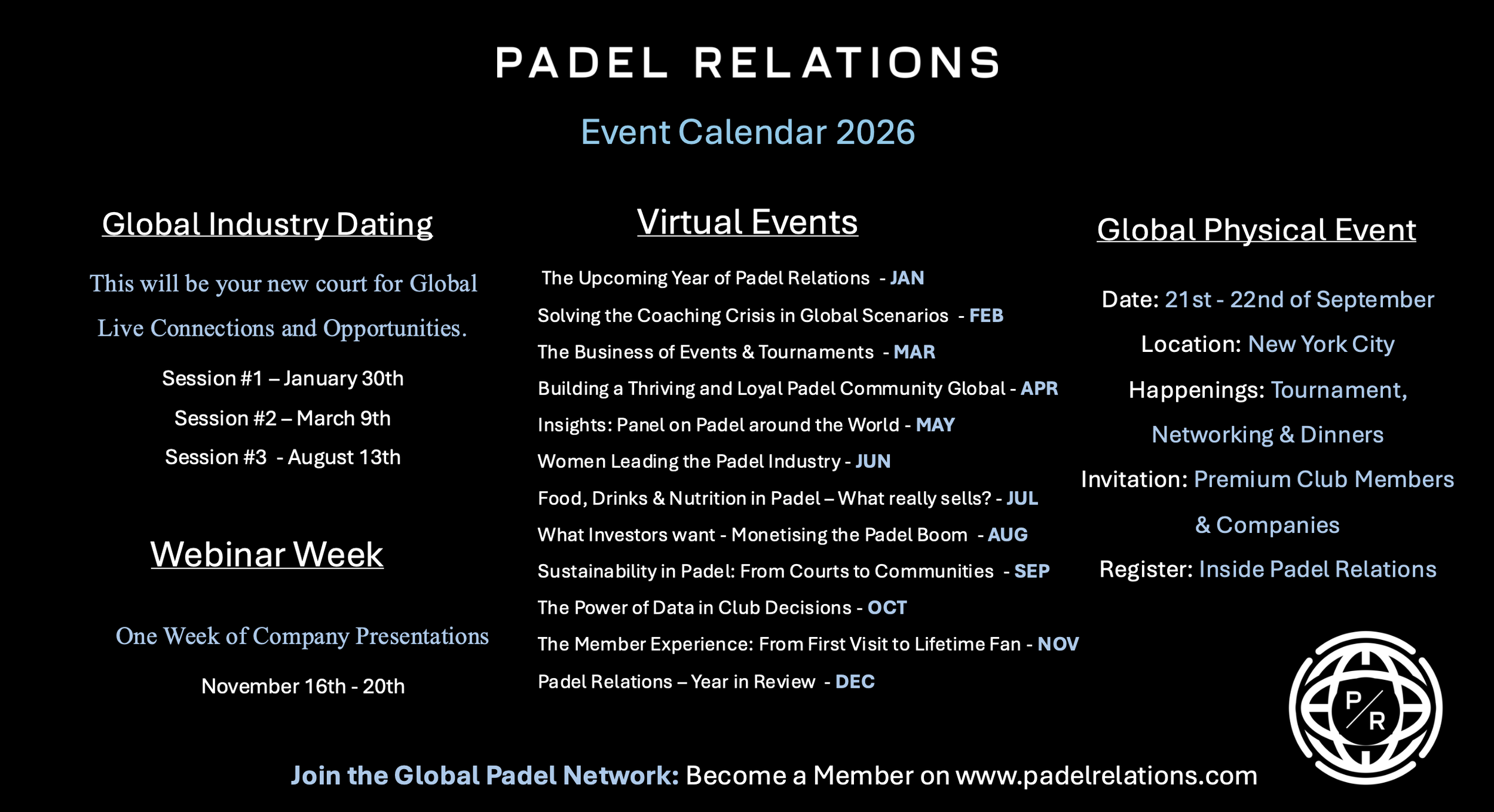 Event Calendar 2026 Dec 20 Written By Victoria Pahlett Padel Relations releases the Event Calendar for 2026. This will be a lot of fun so don’t miss it! Victoria Pahlett